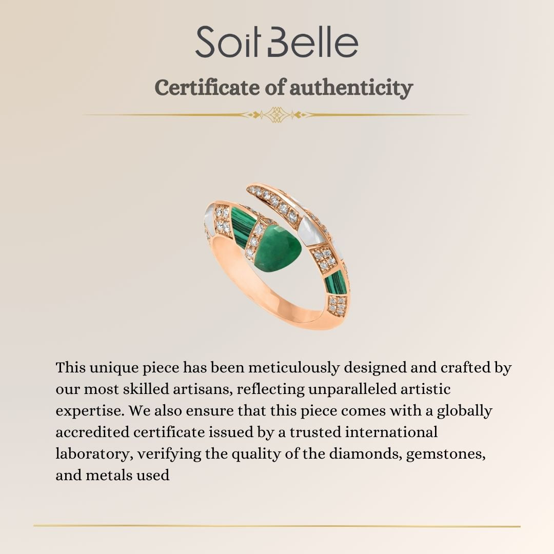 This luxury 18K rose gold diamond ring celebrates the timeless beauty of natural emerald through an artistic and refined design. The vibrant green gemstone forms the centerpiece, symbolizing sophistication and enduring elegance.