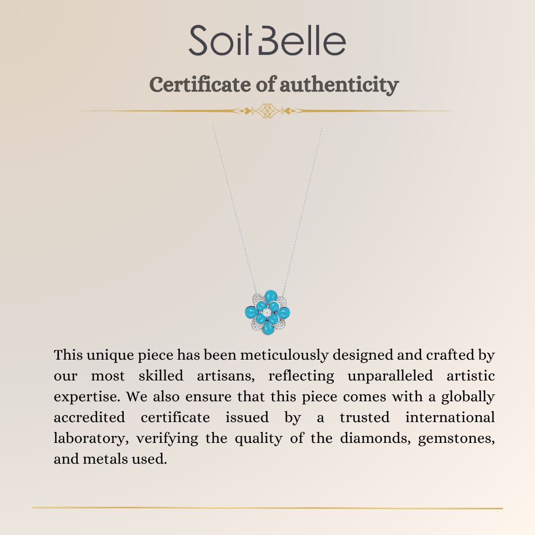 The RONZA White Gold Diamond Pendant with Turquoise is a stunning harmony of color, brilliance, and timeless elegance. Expertly handcrafted in luminous 18K white gold, this pendant features a natural turquoise gemstone, treasured for its vivid blue-green hue symbolizing serenity, vitality, and protection.
