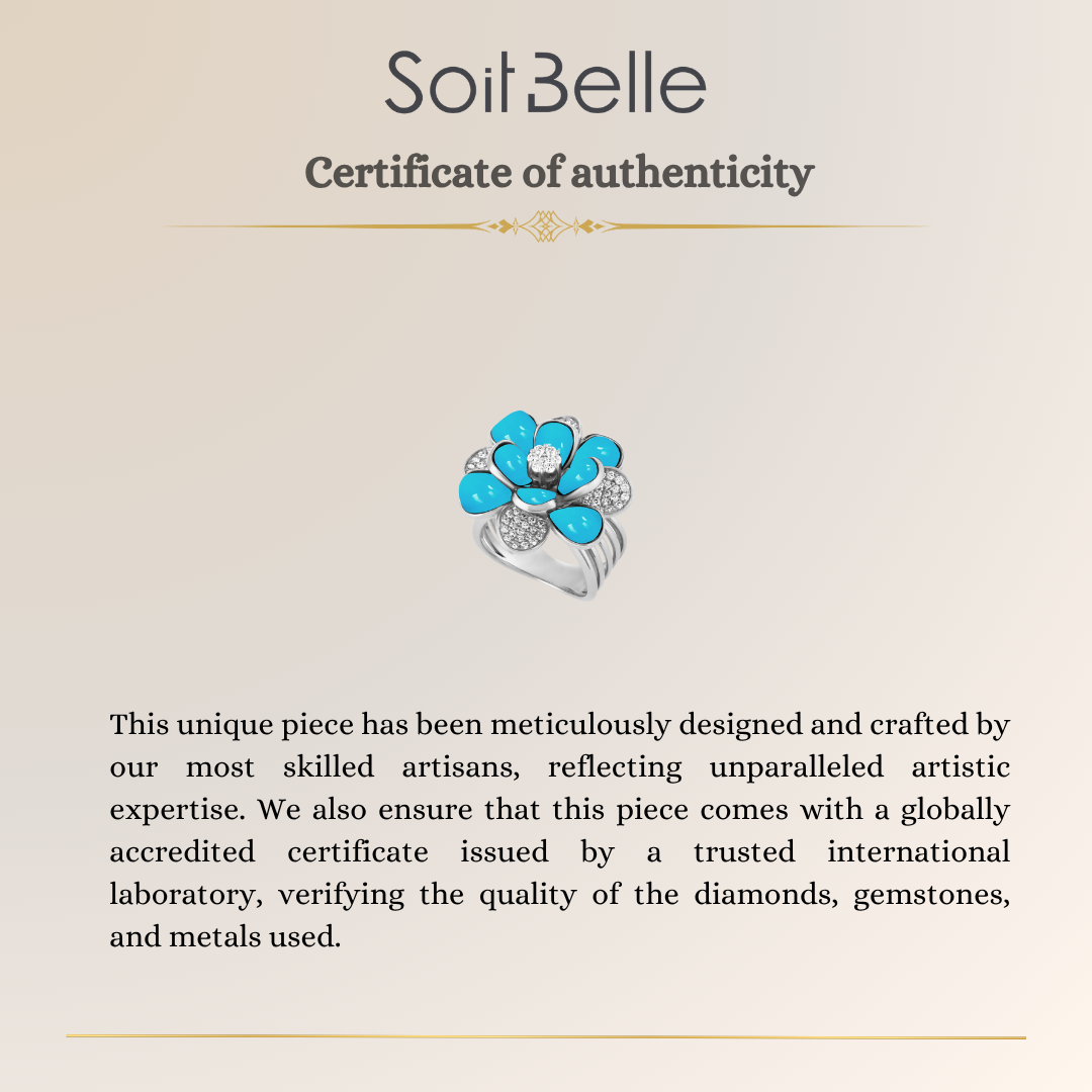 • Gemstones: Features natural turquoise surrounded by brilliant-cut white diamonds.