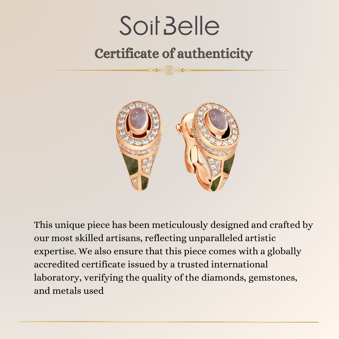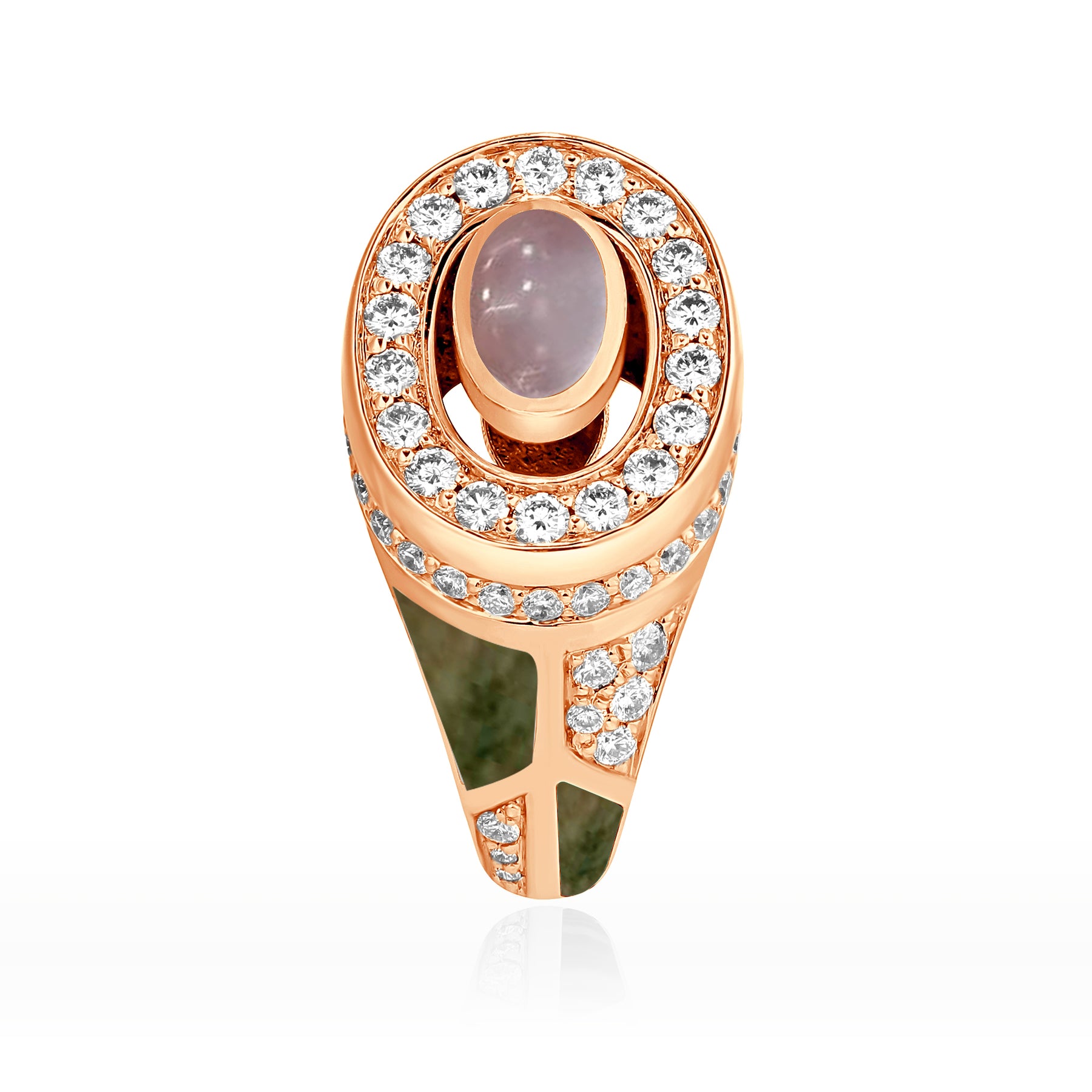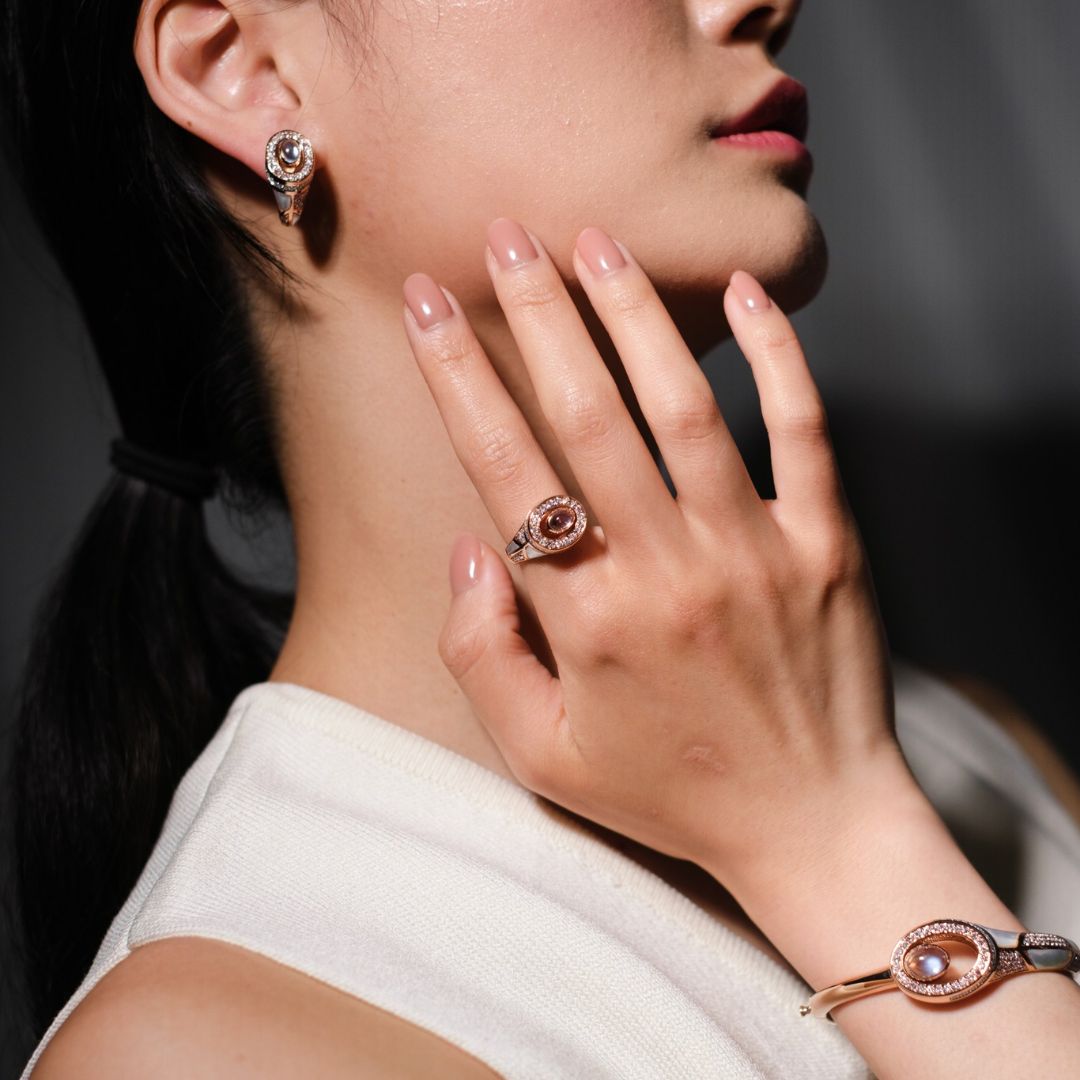 Natural diamonds add refined brilliance, enhancing the gemstone’s glow while maintaining balance and structure. The warmth of rose gold complements the stone’s subtle color, resulting in fine jewellery defined by understated sophistication.