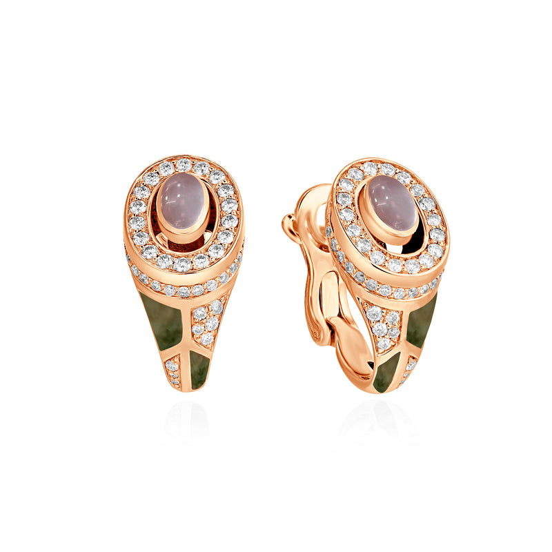 These luxury 18K rose gold diamond earrings highlight the delicate beauty of natural rose quartz. Known for its gentle blush tone, rose quartz introduces a soft luminosity that feels graceful and timeless.