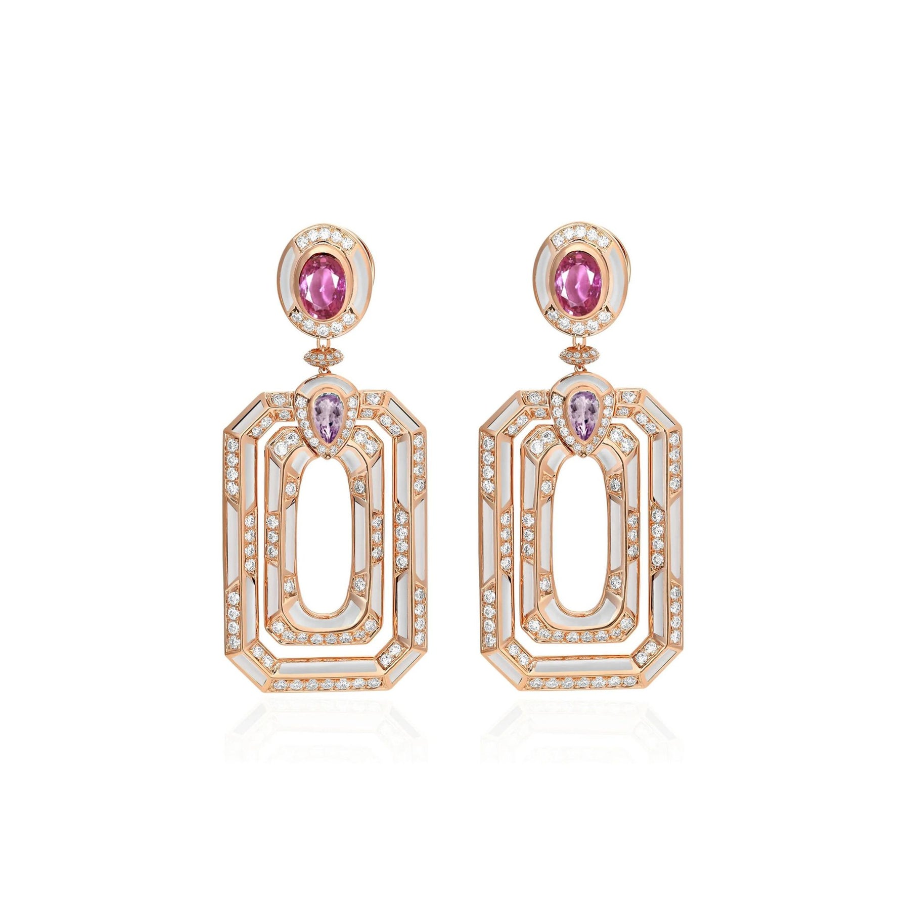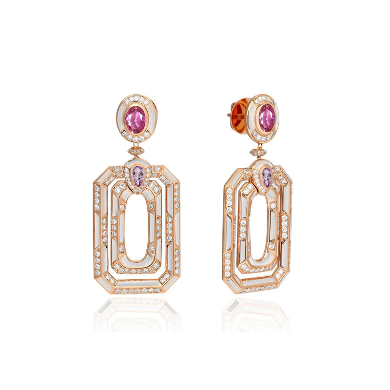 These luxury 18K rose gold diamond earrings are defined by their clean rectangular silhouette. The geometric structure creates a bold yet refined presence, offering a contemporary interpretation of classic diamond jewellery.