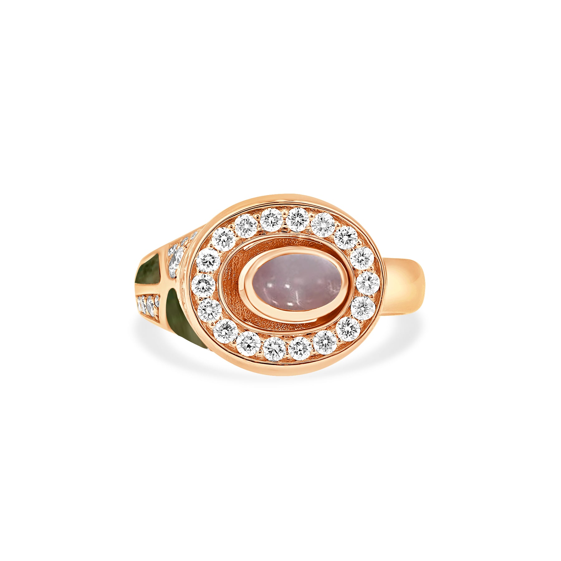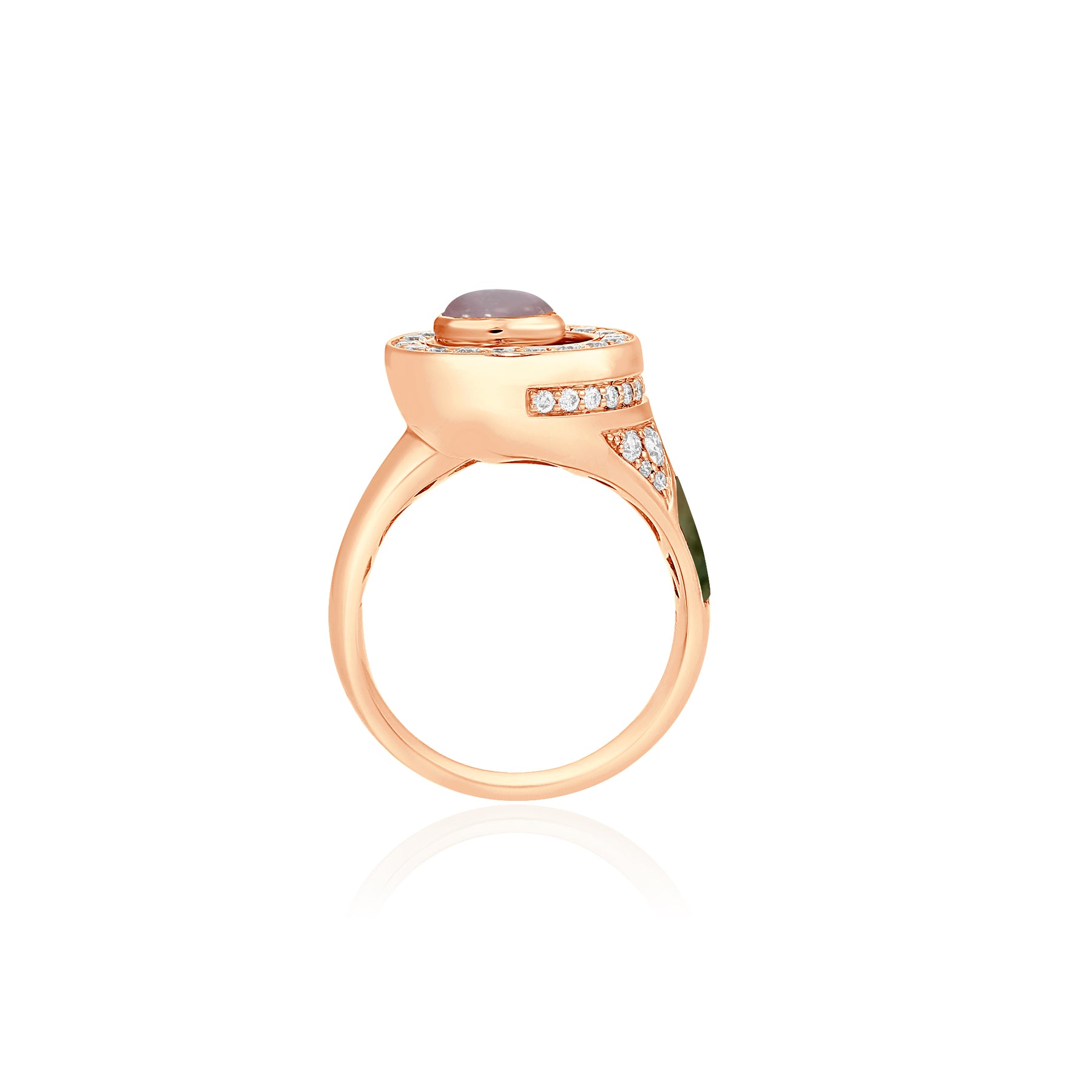 This luxury 18K rose gold diamond ring showcases the soft luminosity of natural rose quartz. Its gentle pink hue introduces warmth and subtle brilliance, creating a refined and graceful presence.