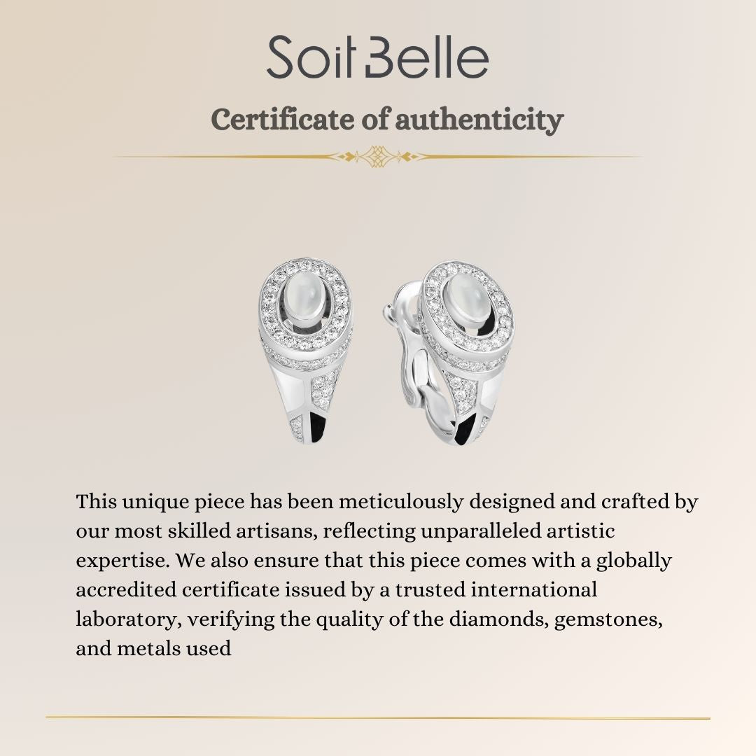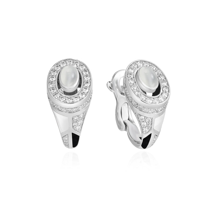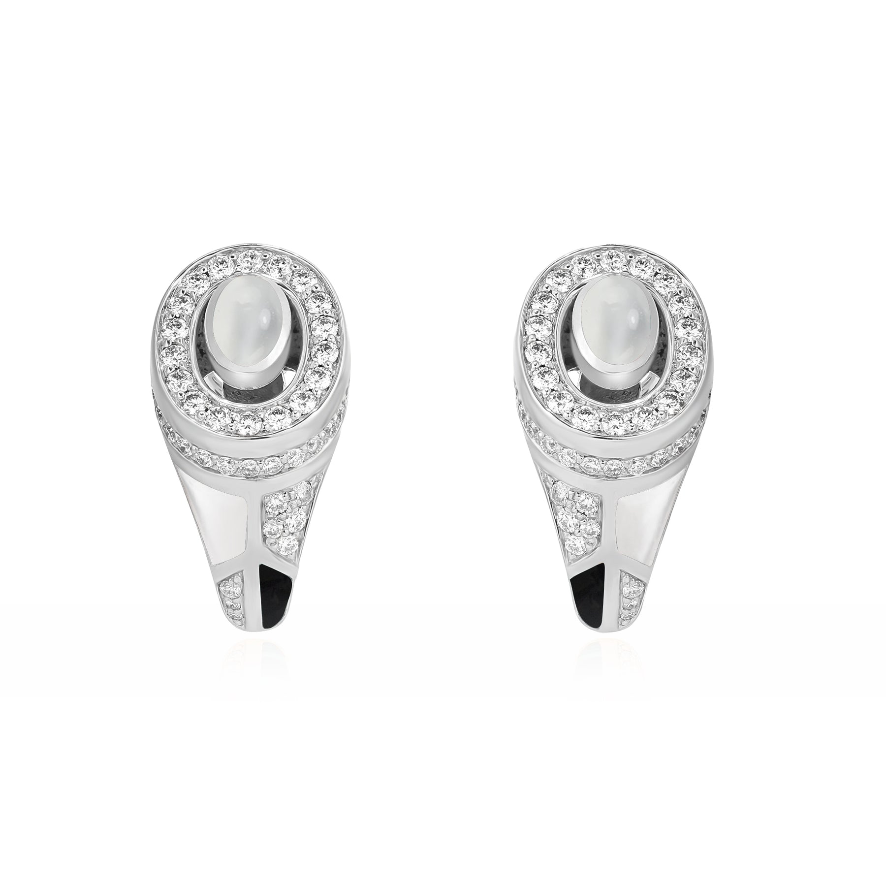 These luxury 18K white gold diamond earrings showcase the soft radiance of natural moonstone. Known for its delicate sheen and luminous surface, moonstone introduces an ethereal quality that feels graceful and refined.