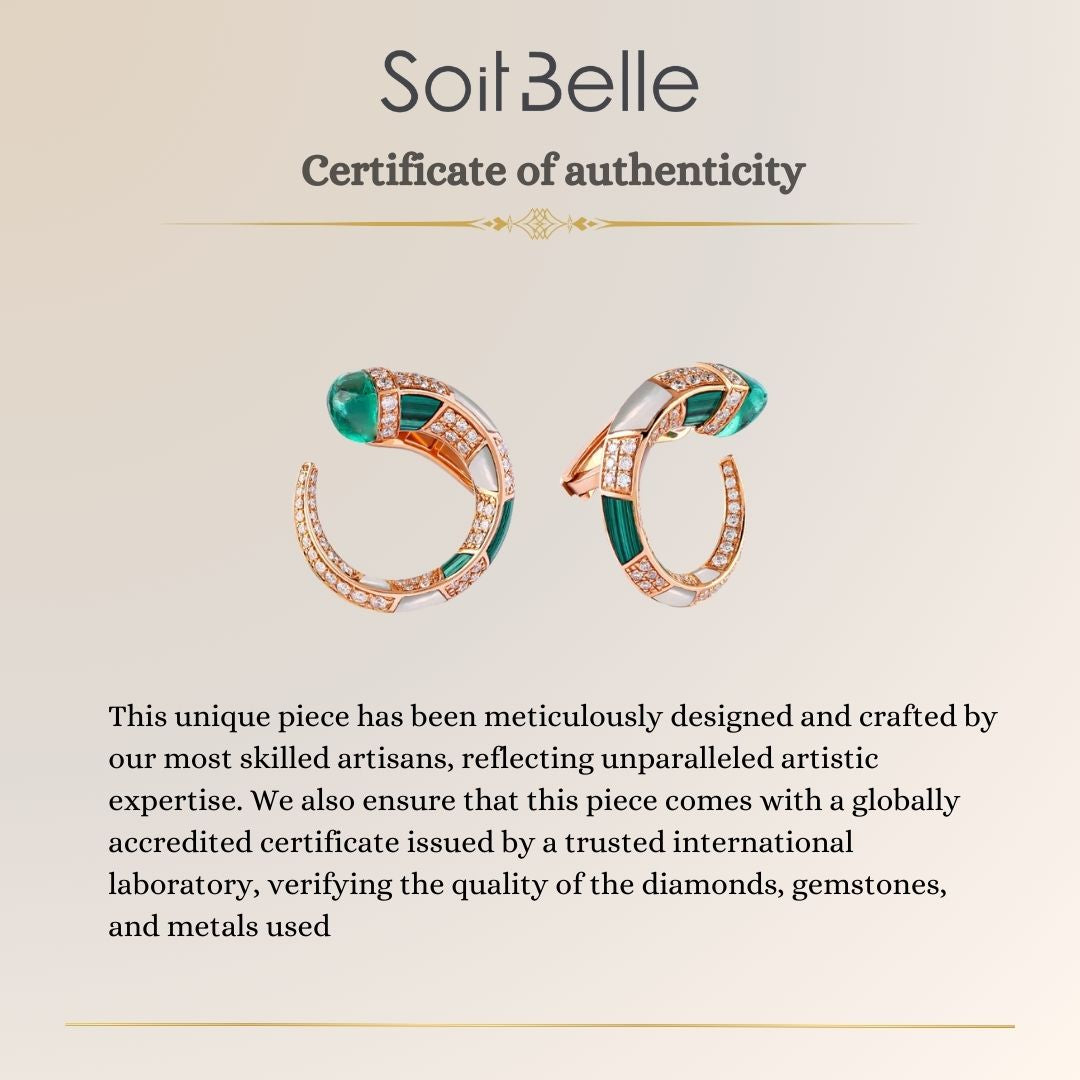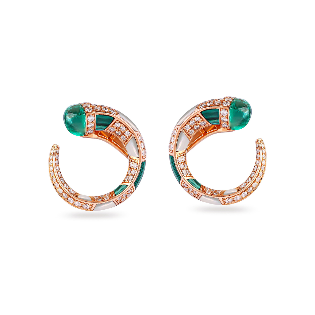 These luxury 18K rose gold diamond earrings highlight the vibrant depth of natural emerald. The gemstone’s rich green tone introduces timeless sophistication while maintaining a modern and elegant presence.