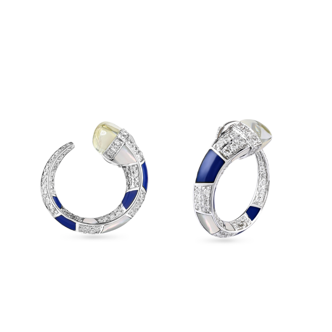 These luxury 18K white gold diamond earrings showcase the vibrant warmth of natural citrine. Its luminous golden hue creates a striking contrast against the cool brilliance of white gold, resulting in a refined yet eye-catching statement.