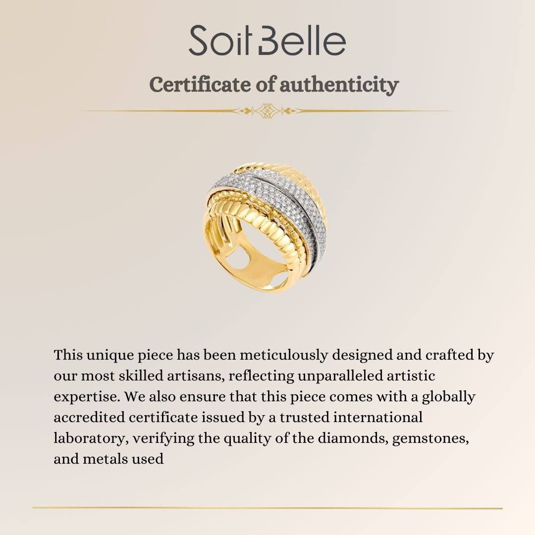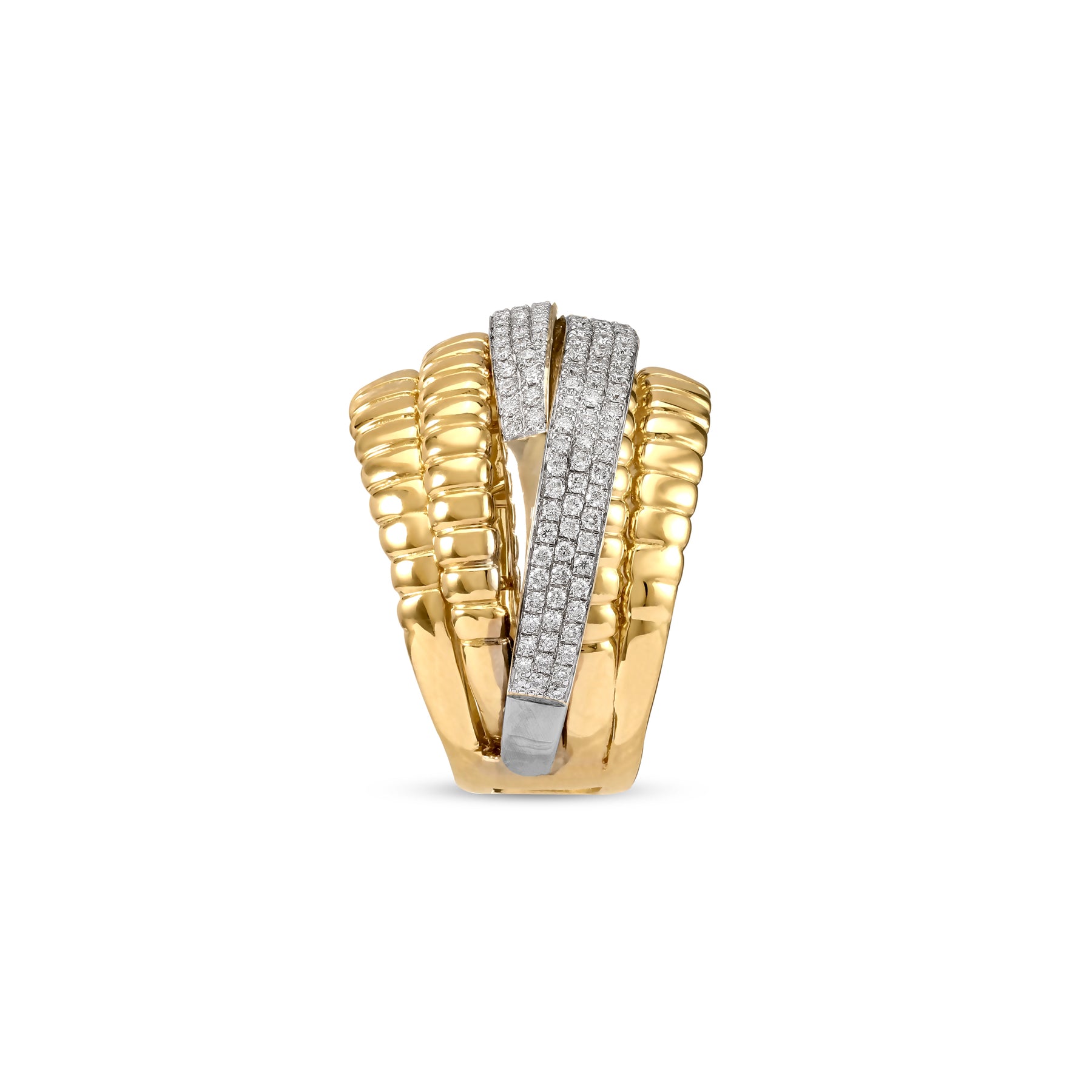 This luxury 18K yellow gold overlapping diamond ring captures contemporary refinement through its sculptural layered design. The overlapping bands create fluid movement and dimensional depth, forming a dynamic yet harmonious silhouette.