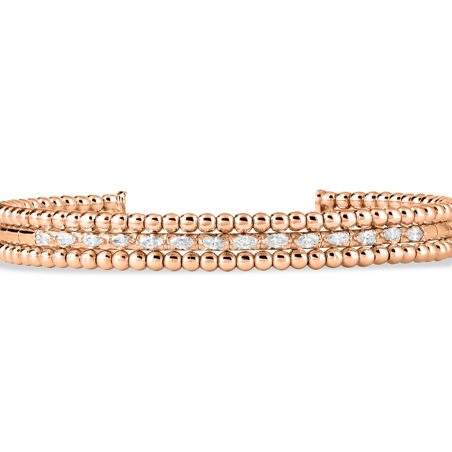 This luxury 18K rose gold marquise diamond bangle celebrates refined structure through the elegant rhythm of marquise-cut diamonds. Their elongated silhouette enhances light reflection, creating a seamless flow of brilliance that wraps gracefully around the wrist.