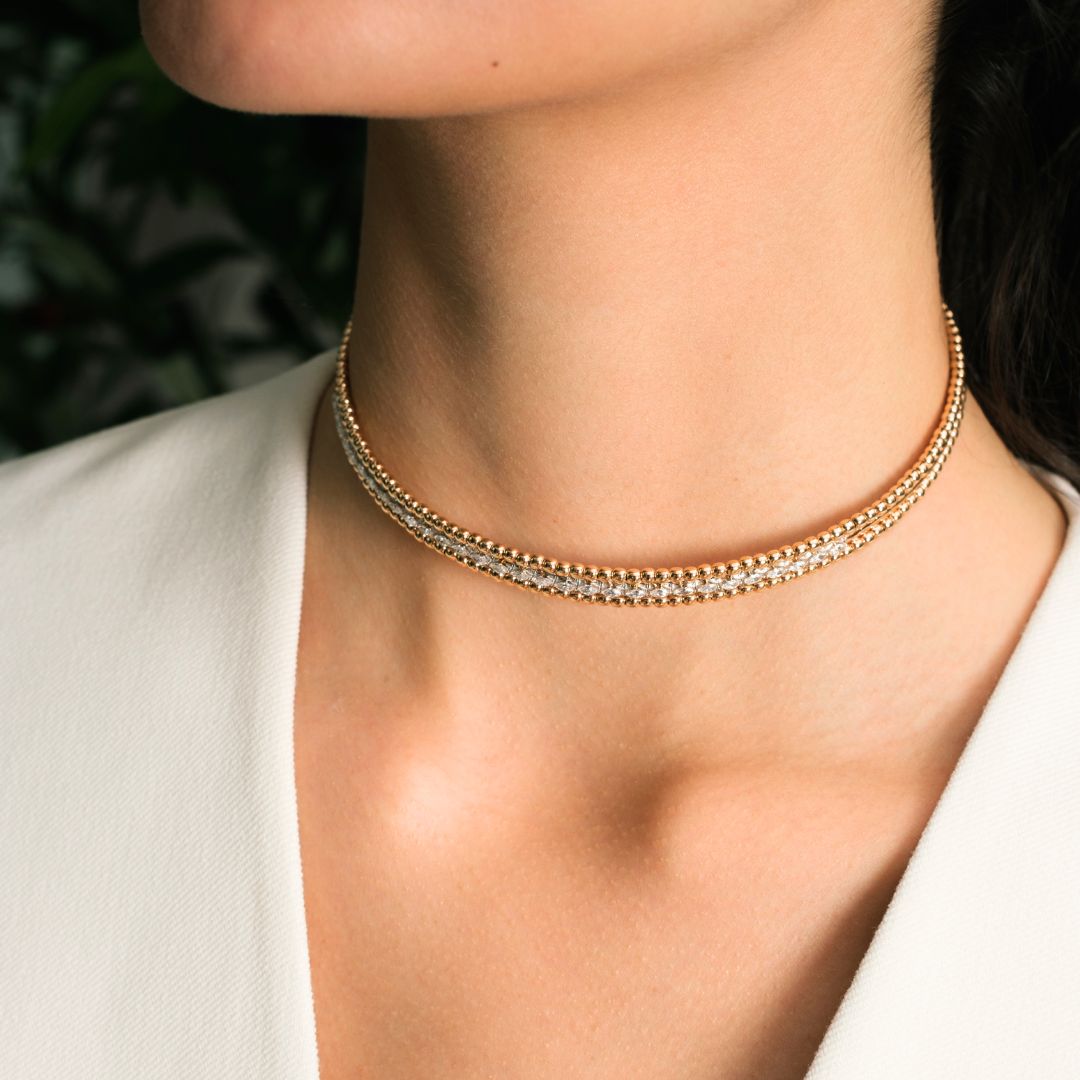 This luxury 18K rose gold marquise diamond choker embodies contemporary elegance through precise structure and radiant brilliance. The elongated marquise diamonds create a graceful rhythm along the neckline, offering a refined yet striking presence.