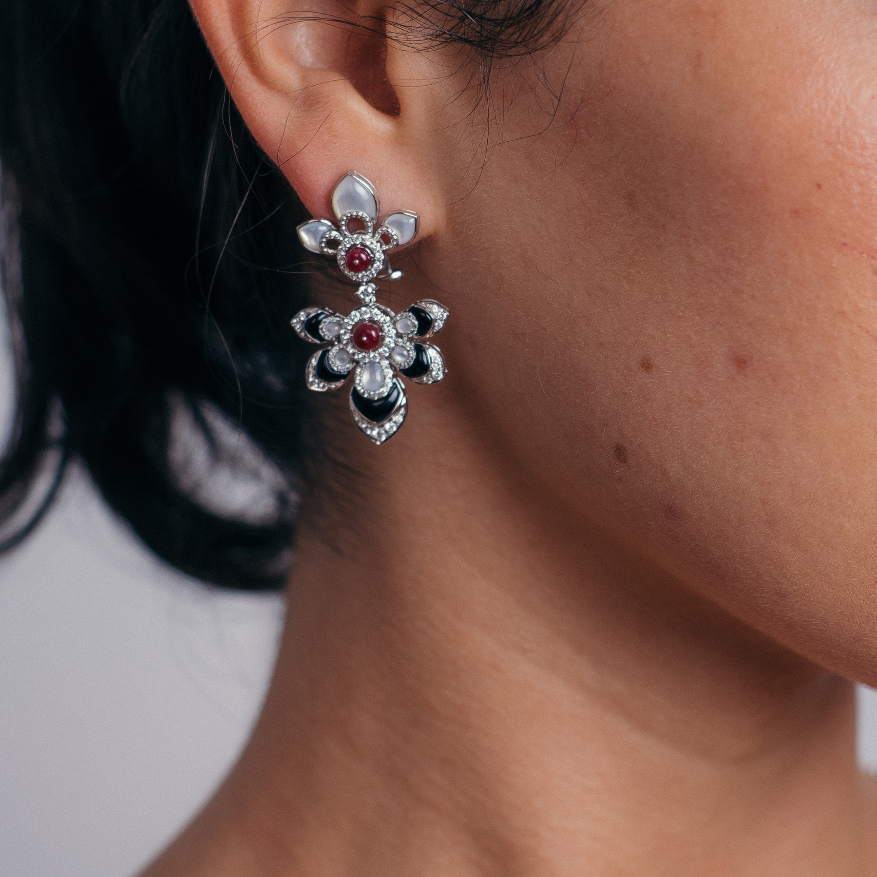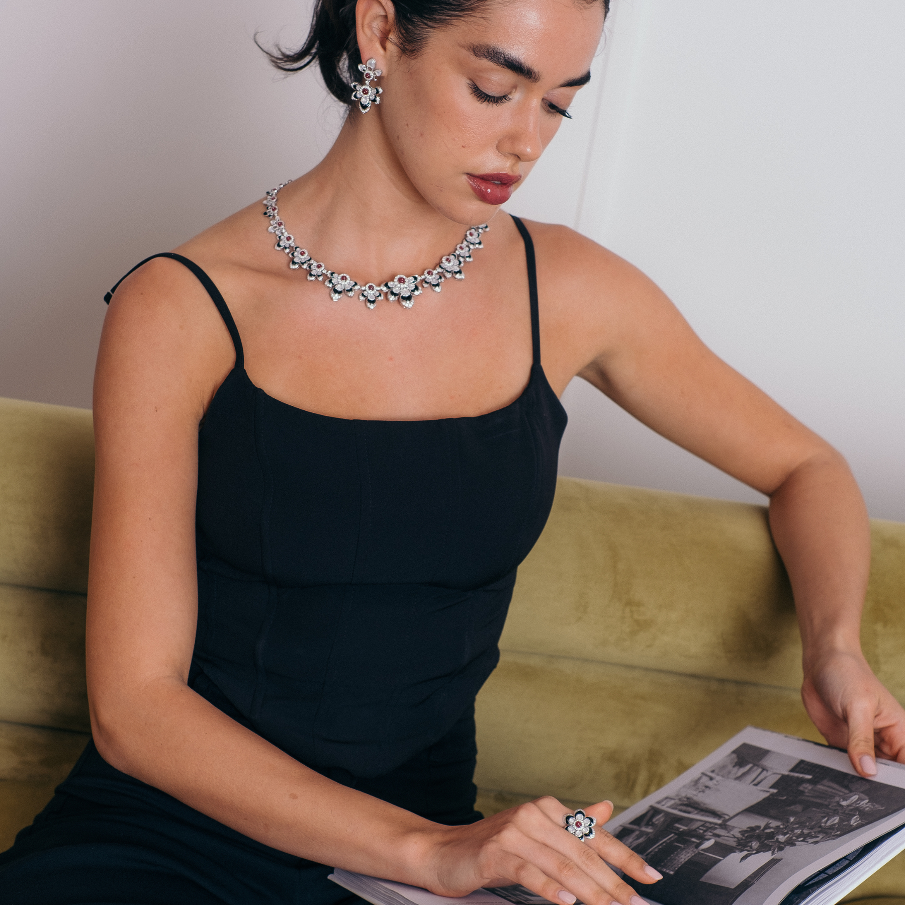 يُبرز هذا الطقم الفاخر المصنوع من الذهب الأبيض عيار 18 قيراط التباين الآسر بين الياقوت الطبيعي والعقيق الأسود. يمنح اللون الأحمر العميق للياقوت إحساسًا بالشغف والفخامة الكلاسيكية، بينما يضيف العقيق الأسود بعمقه القوي لمسة درامية وأناقة جريئة تعزز حضور التصميم, مصحوب بشهادة دولية معتمدة.