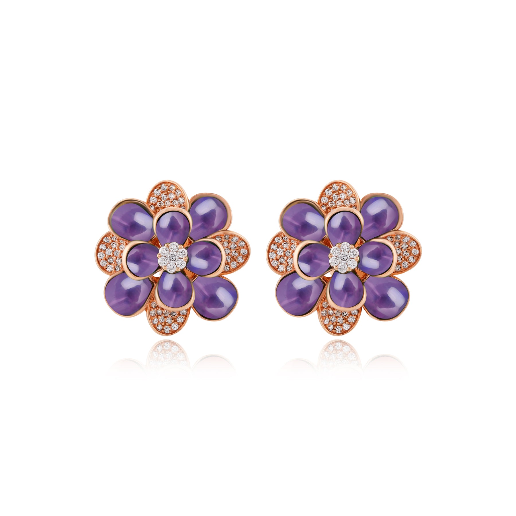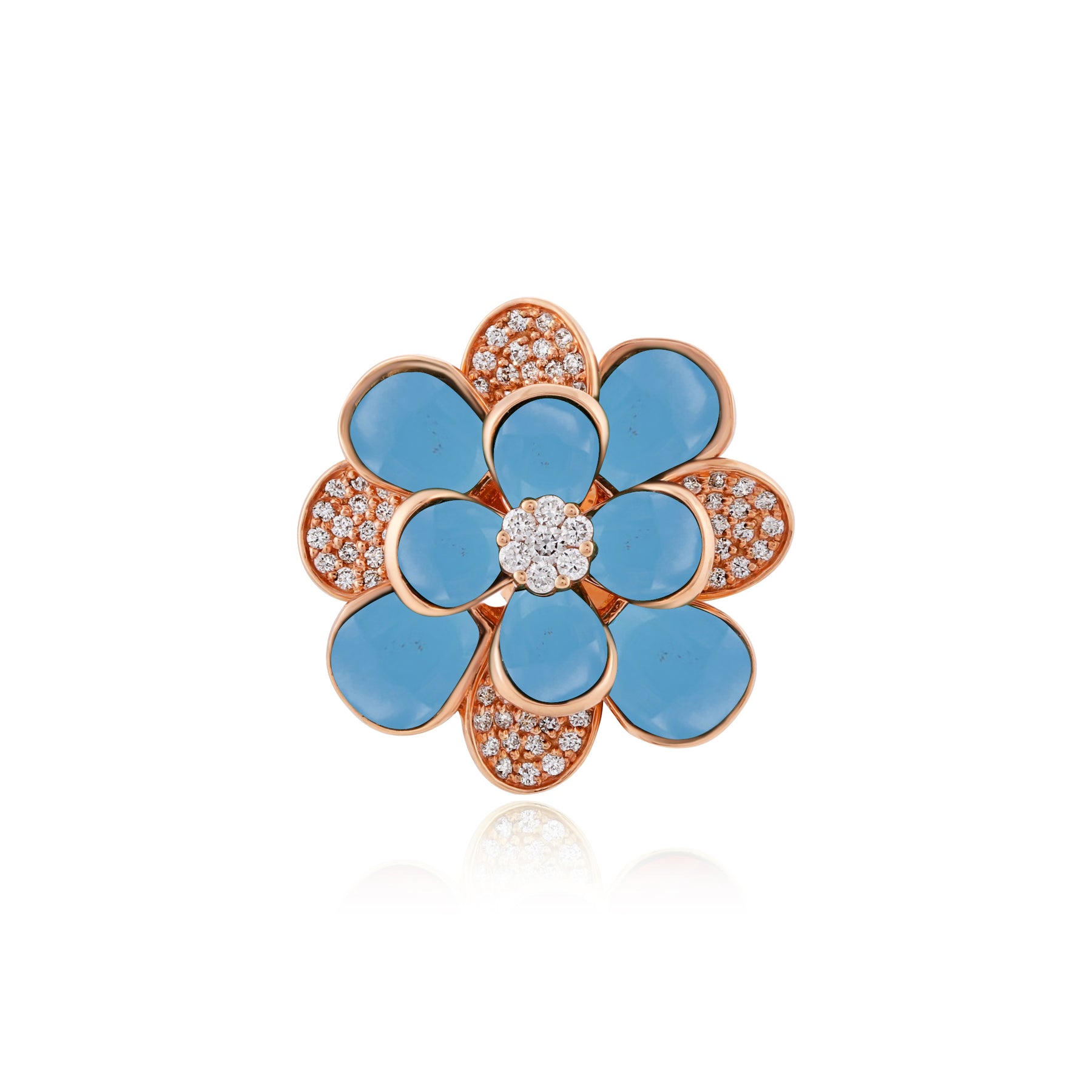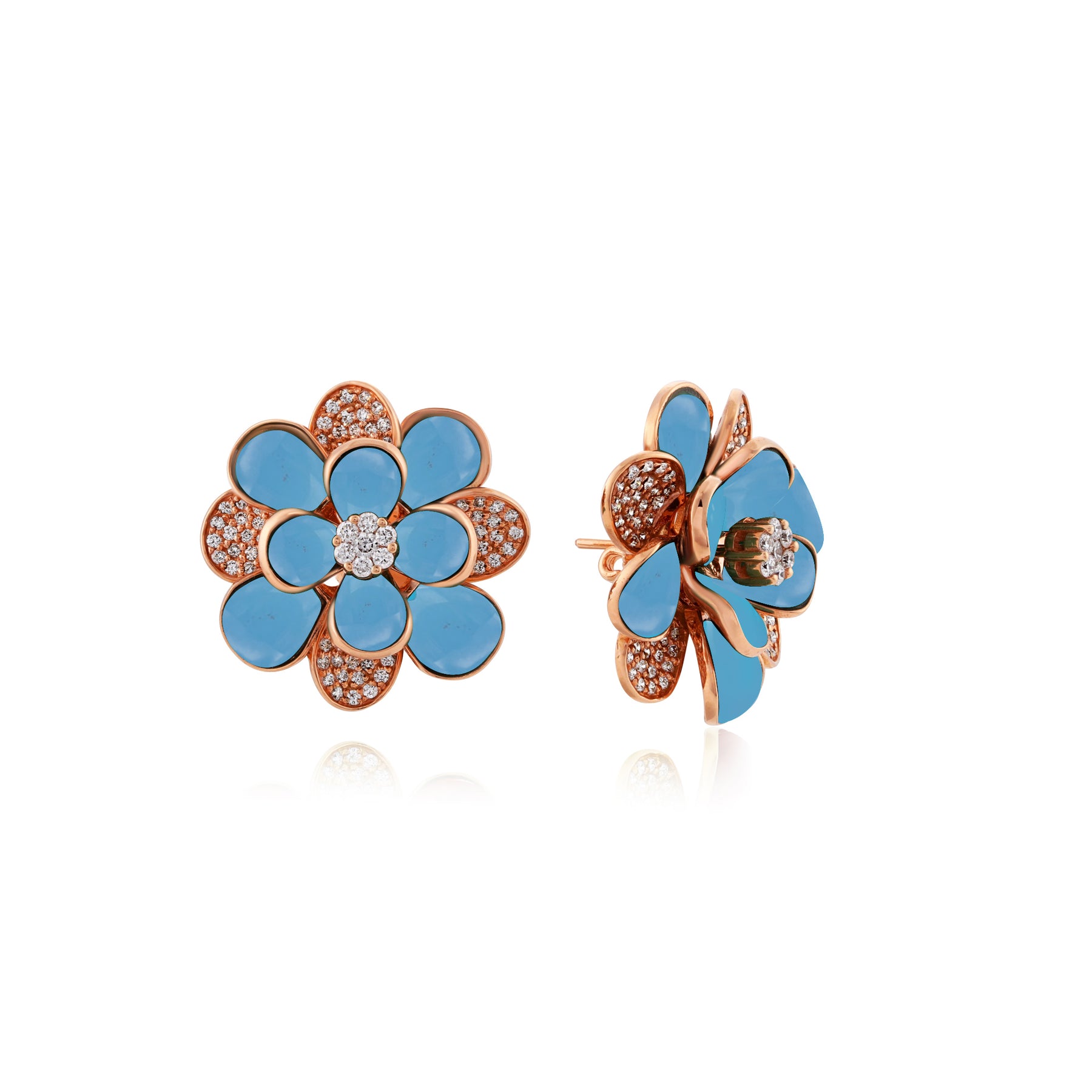 The RONZA Rose Gold Diamond Earrings with Blue Chalcedony blend graceful design with tranquil beauty. Handcrafted in radiant 18K rose gold, these exquisite earrings feature natural blue chalcedony gemstones, admired for their soothing sky-blue hue that symbolizes calmness, confidence, and emotional balance.