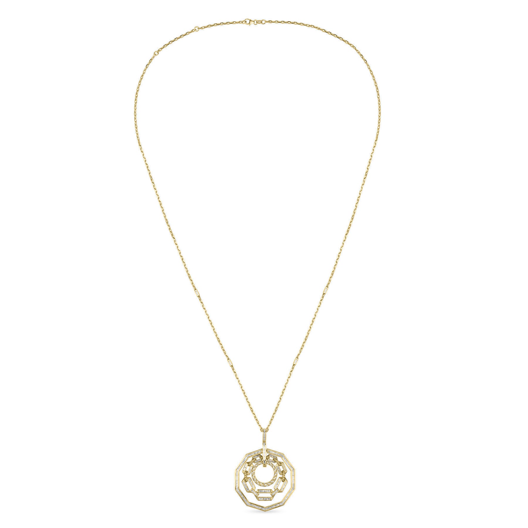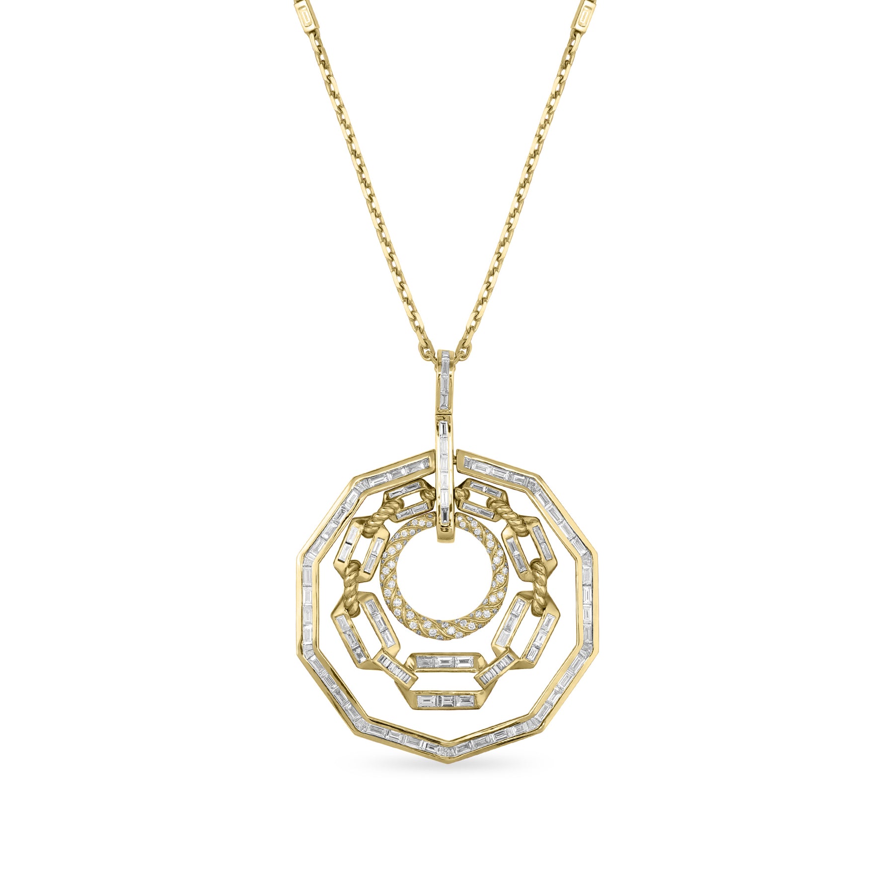 The pendant is lavishly adorned with a combination of baguette-cut and round brilliant diamonds, carefully set to create dynamic light play and exceptional brilliance. The geometric precision of baguettes paired with the sparkle of round diamonds adds depth, contrast, and modern refinement.