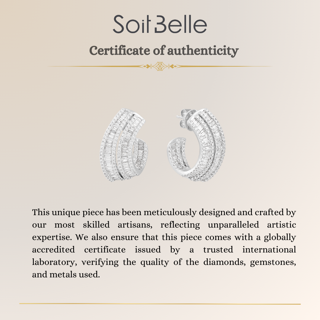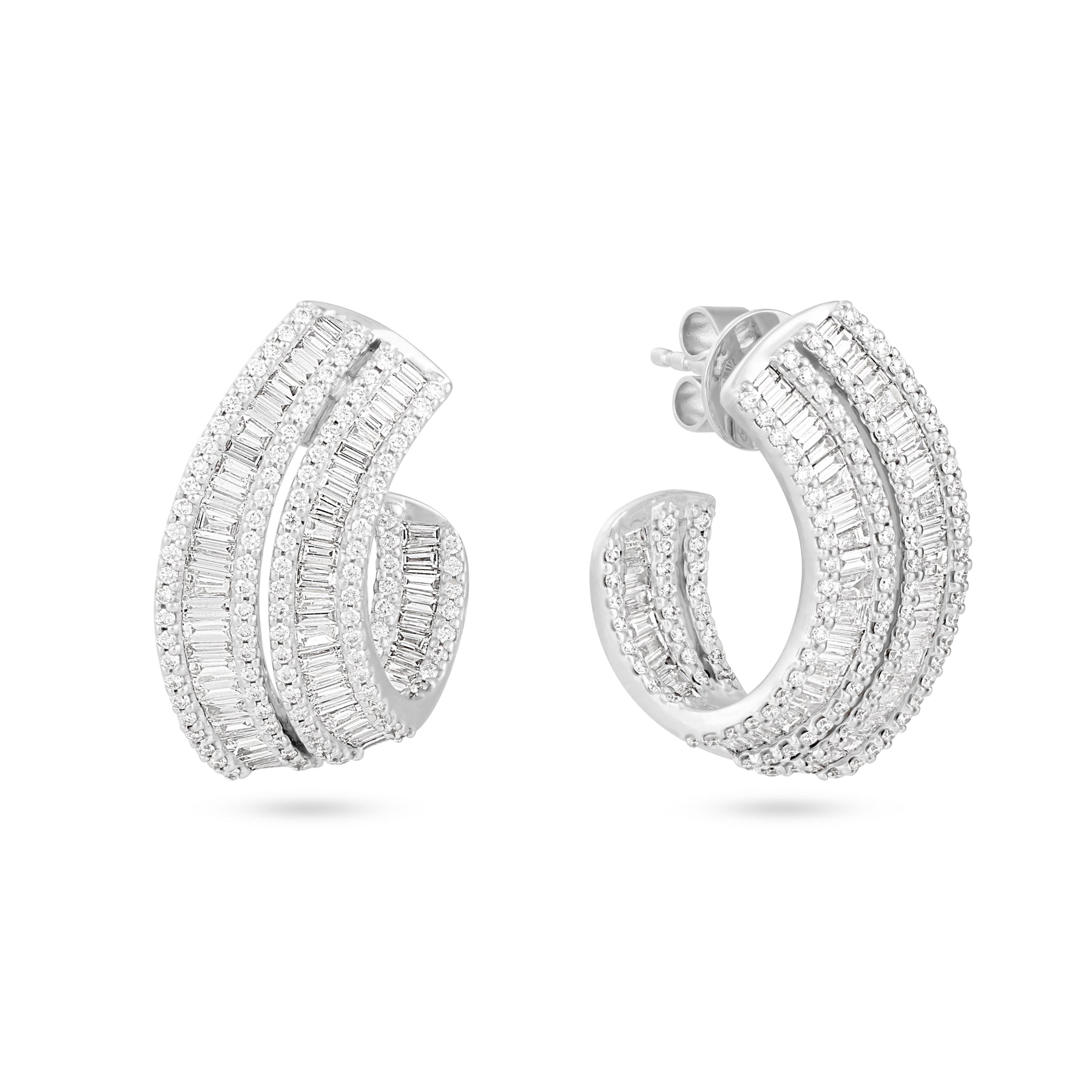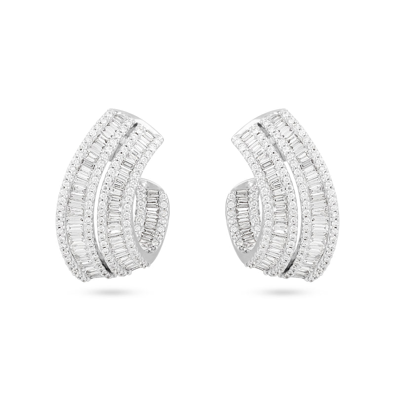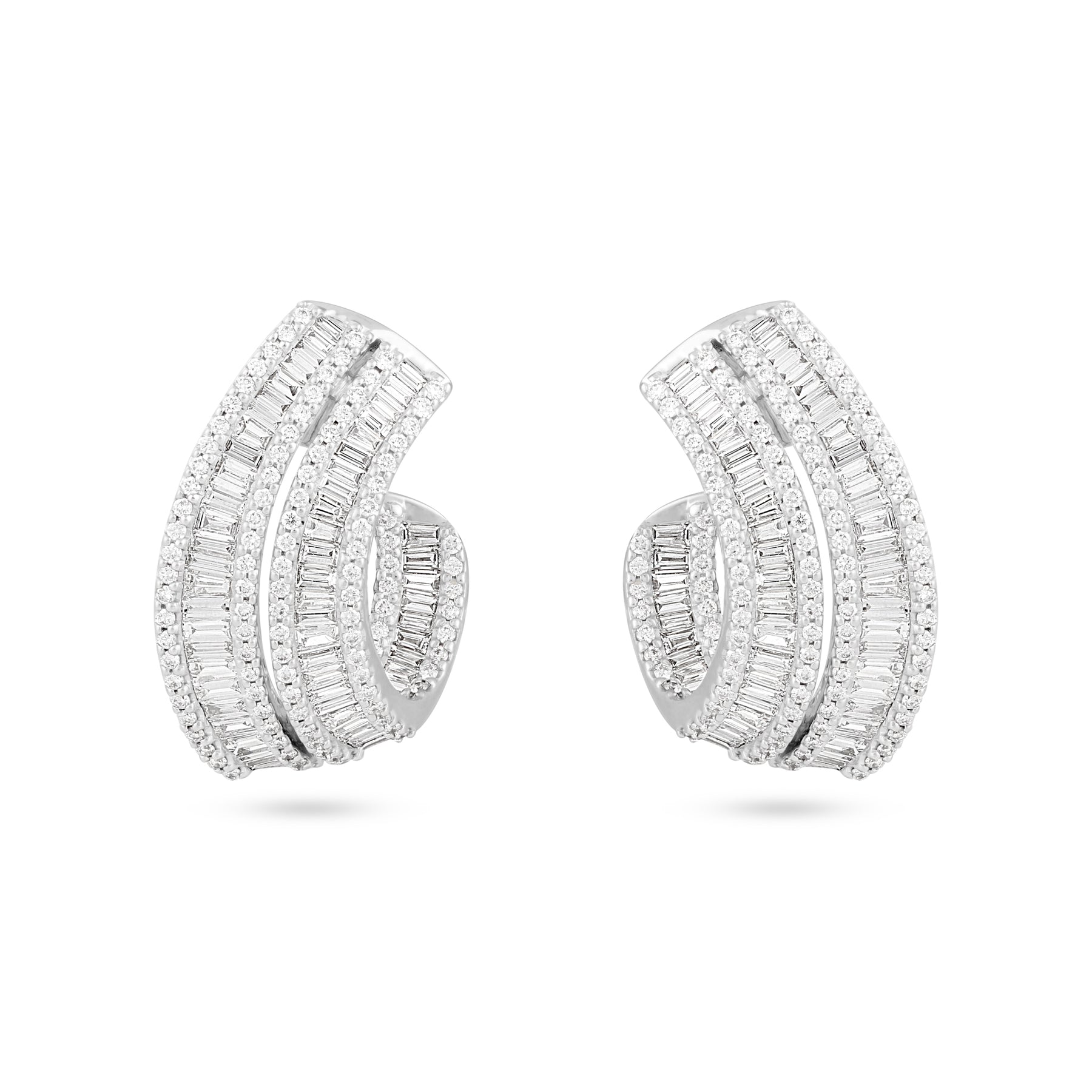 These luxury 18K white gold diamond wave earrings express contemporary elegance through their flowing sculptural silhouette. The wave-inspired design introduces graceful movement, allowing natural diamonds to follow a luminous curve that enhances the face with refined sparkle.