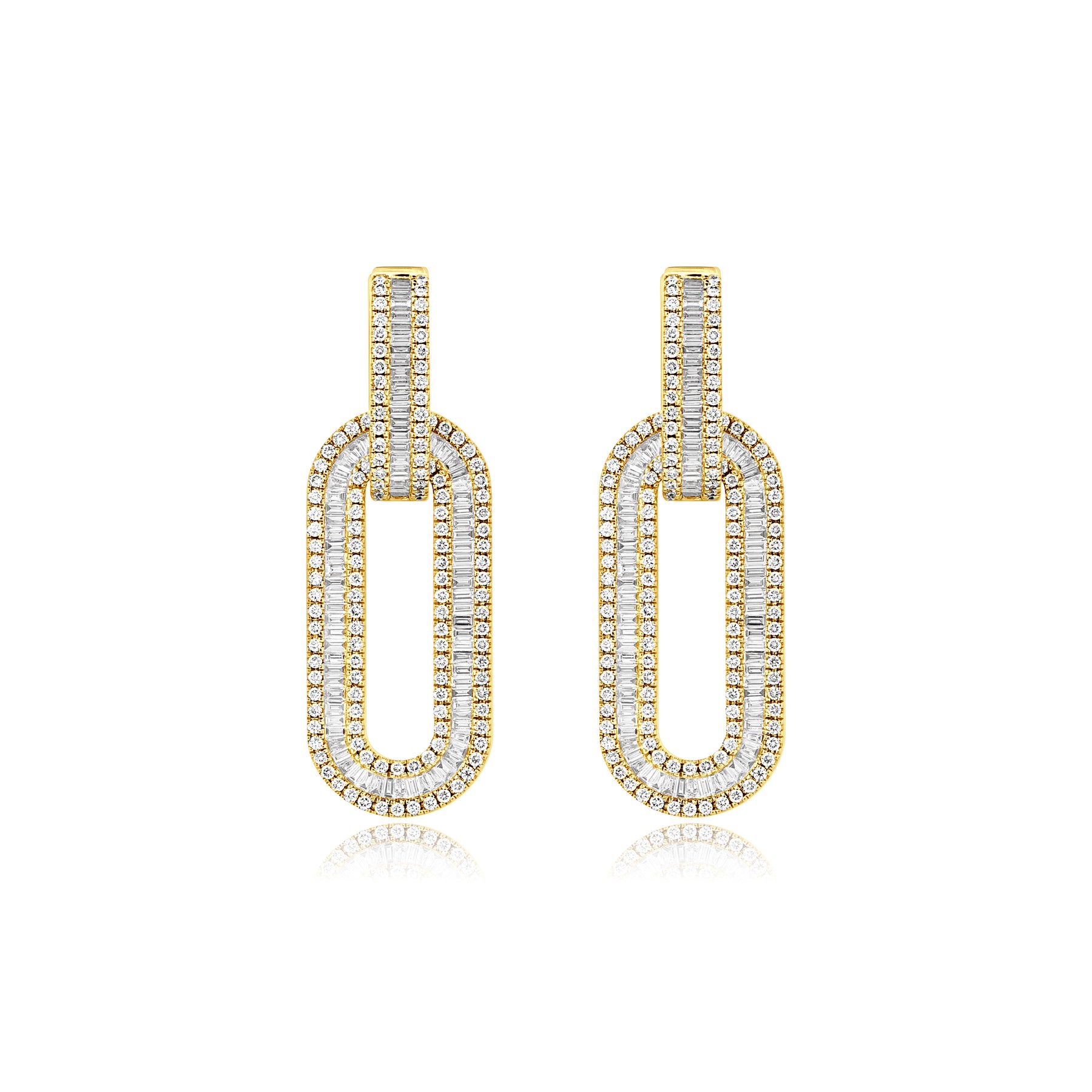 These luxury 18K yellow gold diamond link earrings embody contemporary elegance through their structured, articulated silhouette. Each polished link is enhanced with natural diamonds, forming a rhythmic flow of brilliance that frames the face with refined luminosity.