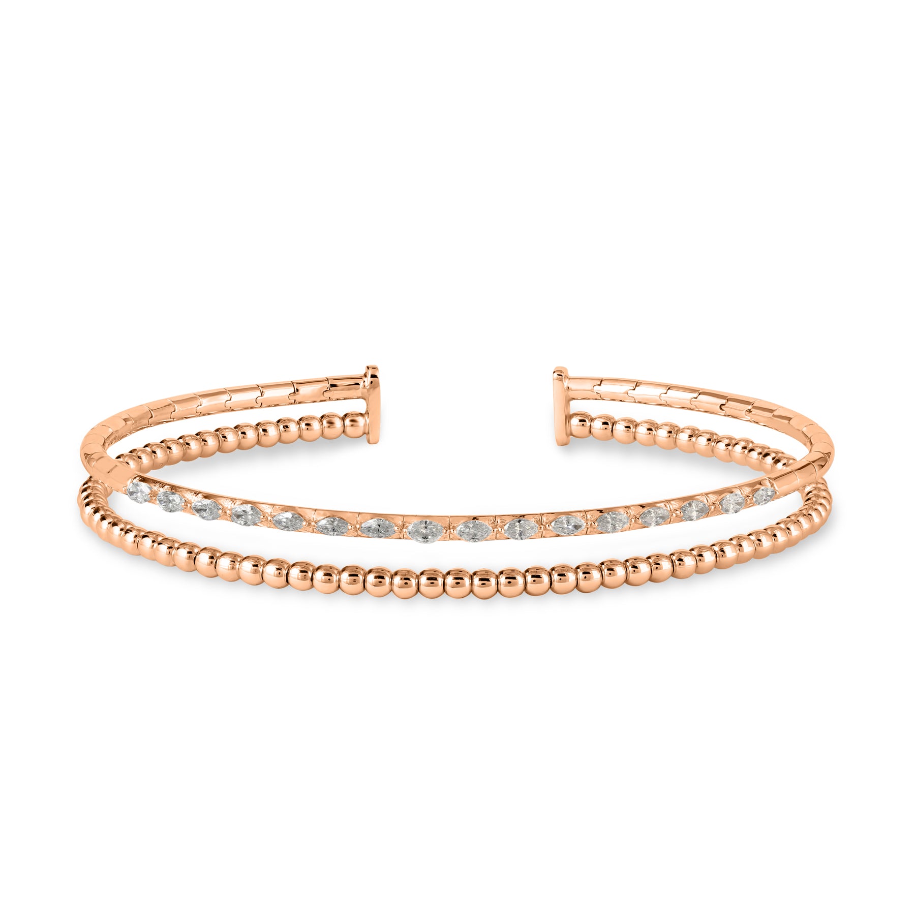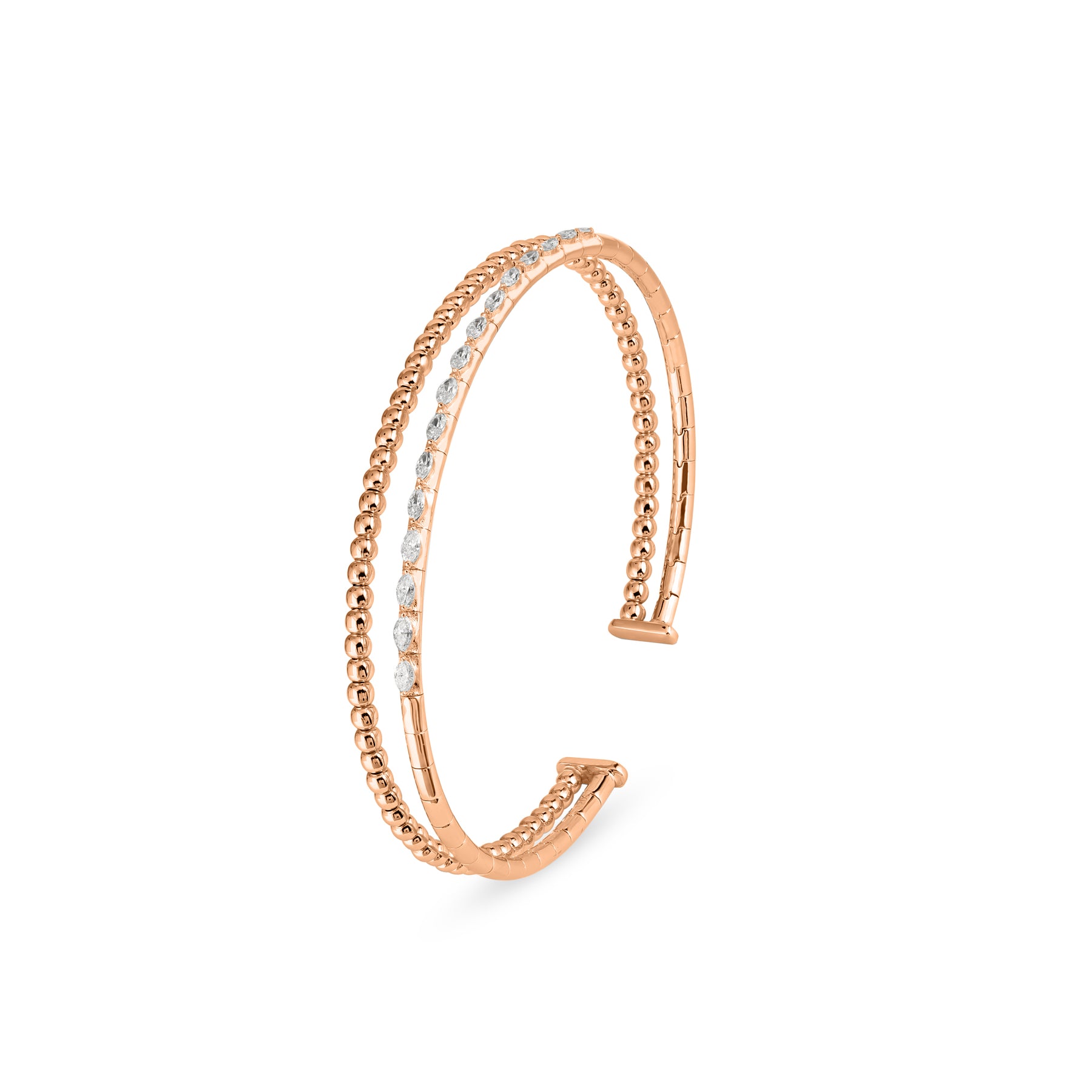 This luxury 18K rose gold marquise diamond bangle showcases the graceful rhythm of marquise-cut diamonds arranged in a refined, sculptural composition. Their elongated silhouette enhances light reflection, creating a continuous flow of brilliance that wraps elegantly around the wrist.