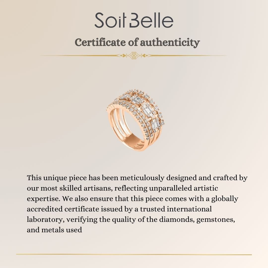 This luxury 18K rose gold layered diamond ring expresses contemporary refinement through its multi-band sculptural design. The layered structure creates dimensional brilliance, allowing natural diamonds to form a luminous and dynamic surface.