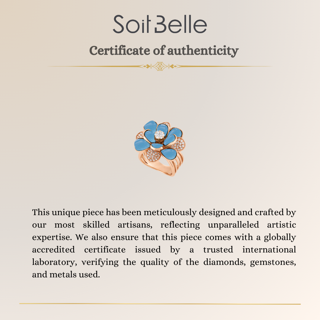 The RONZA Rose Gold Diamond Ring with Blue Chalcedony embodies tranquility, elegance, and refined craftsmanship. Handcrafted in glowing 18K rose gold, this exquisite piece features a natural blue chalcedony gemstone, celebrated for its soft pastel hue symbolizing calm, balance, and clarity.