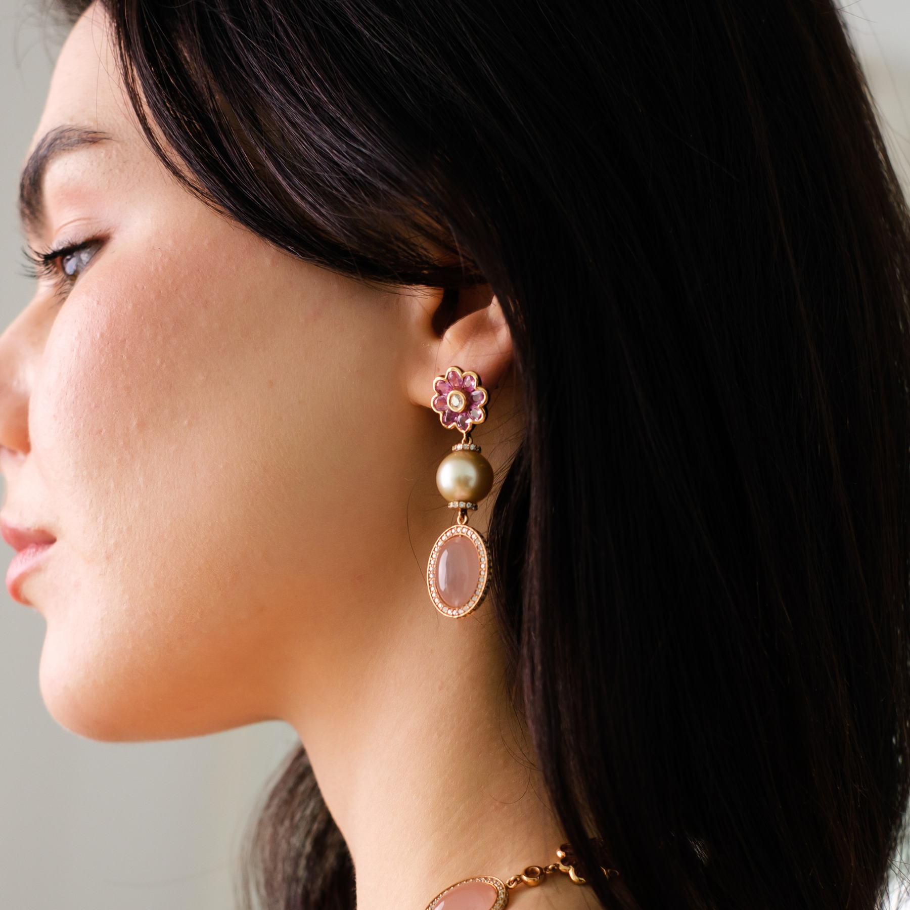 طقم فاخر من الذهب الوردي عيار 18 قيراط مرصّع بالياقوت الوردي الطبيعي واللؤلؤ والكوارتز والألماس الطبيعي