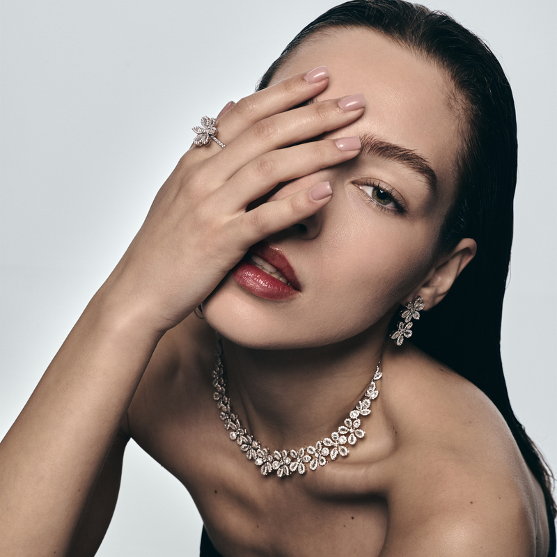 تُكمل أحجار الألماس الطبيعي التصميم ببريق مشعّ يضيف عمقًا وتوازنًا بصريًا، مما يعزز التناسق بين الخطوط الهندسية والتألق الضوئي. كما يبرز اللون البارد للذهب الأبيض صفاء الأحجار ويضاعف قوة انعكاسها، ليمنح القطعة حضورًا حديثًا يجمع بين الإشراق والثقة والرقي.