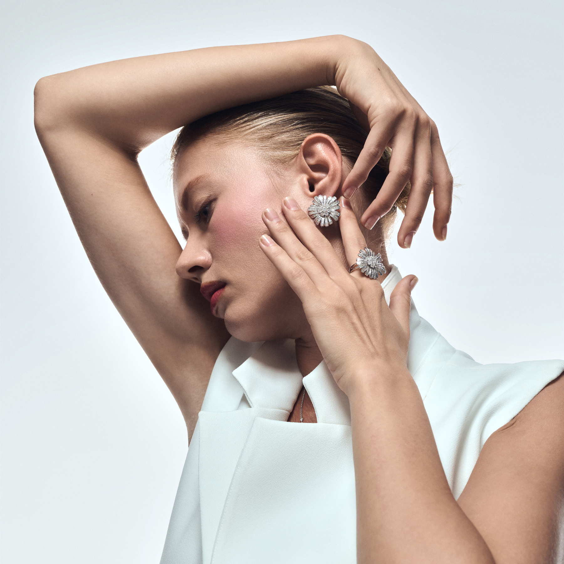 تم تثبيت كل حجر ألماس بعناية فائقة للحفاظ على التناسق المثالي وتعزيز أقصى درجات اللمعان والتألق. ويعمل اللون البارد للذهب الأبيض على إبراز صفاء الألماس وزيادة إشعاعه، ليمنحك قطعة مجوهرات فاخرة تجمع بين الحداثة والرقي والثقة.